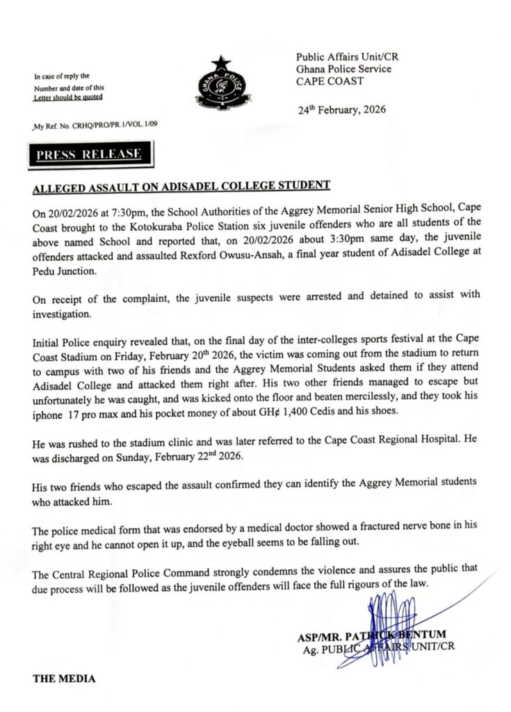 According to a press release issued by the Central Regional Police Command on February 24, 2026, the suspects were handed over to the Kotokuraba Police Station by school authorities on the evening of February 20.