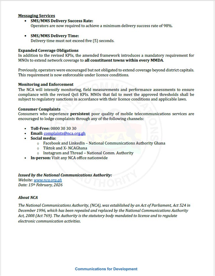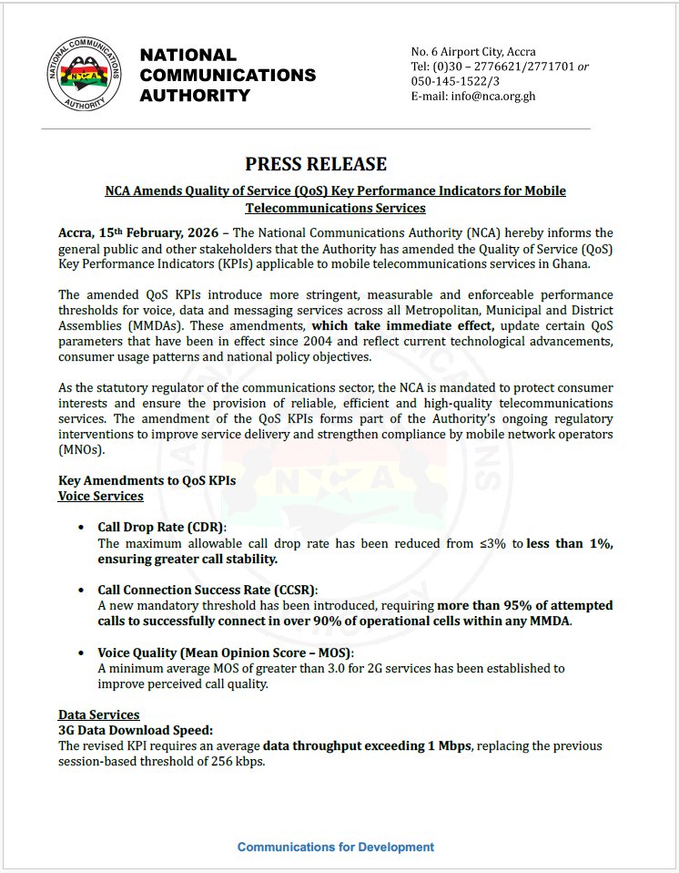 In a statement issued on February 15, 2026, the Authority announced amendments to its Quality of Service (QoS) Key Performance Indicators (KPIs), which take immediate effect nationwide.